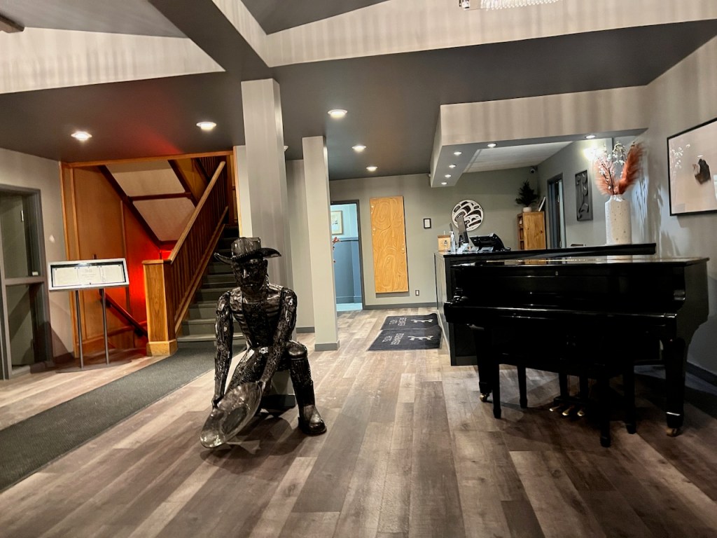 The hotels attached restaurant, the “Belly of the Bison”, was also located just off the main lobby. The lobby contained a black grand piano and a prospector sculpture, which led to a somewhat historic theme of the gold rush in Whitehorse.