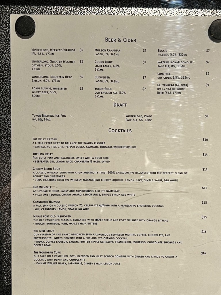 The Belly of the Bison featured a contemporary menu which was modern in taste and ingredients. Given the remote location of Whitehorse, I didn’t find that pricing on the menu to be too beyond what would be expected.