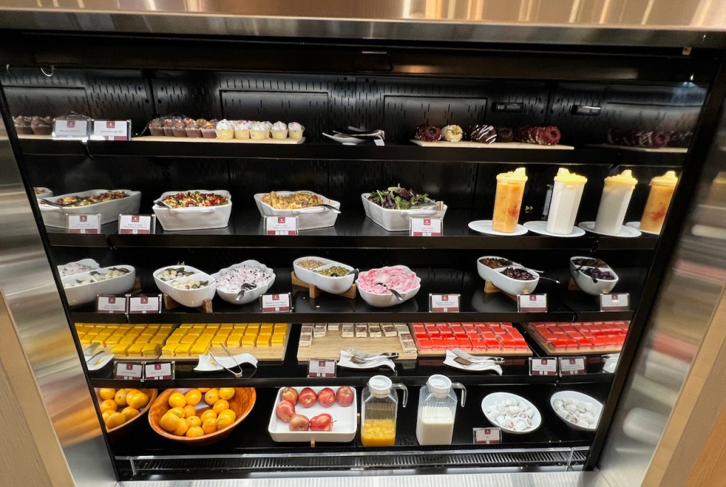 The food and beverage station is set up right next to the entrance. It features a combination of a rail countertop serving hot items, a stand up cooler of refrigerated items. During my breakfast hour visit, there was also a few items set up on the bar.