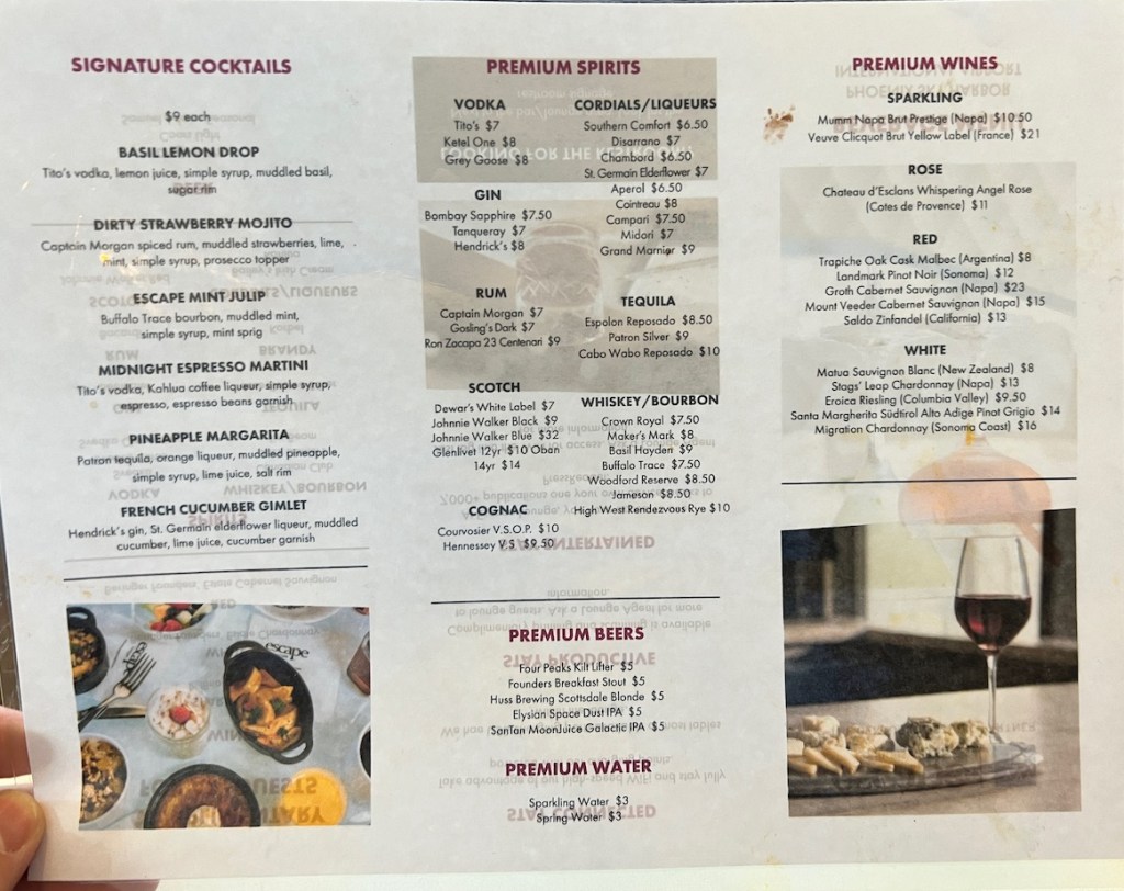 The first side of the menu offered complimentary wines, spirits and beer. Whereas the second side of the menu offered signature cocktails at $9 USD each, along with premium spirits at $7 – $10 USD each and premium wines at $10 – $14 USD each.