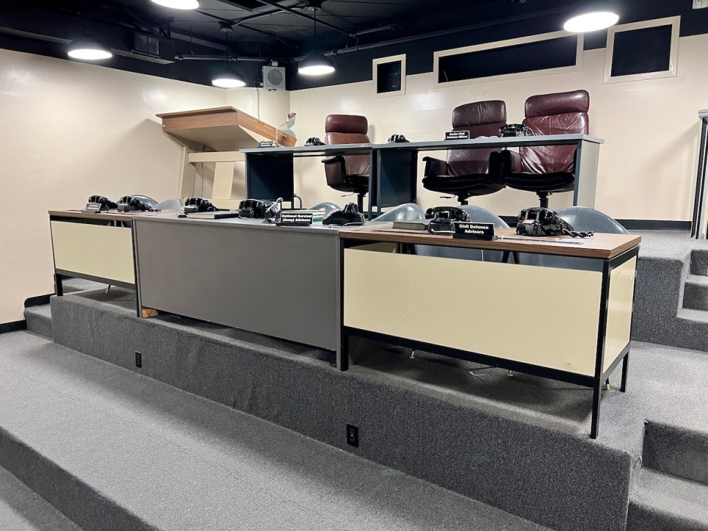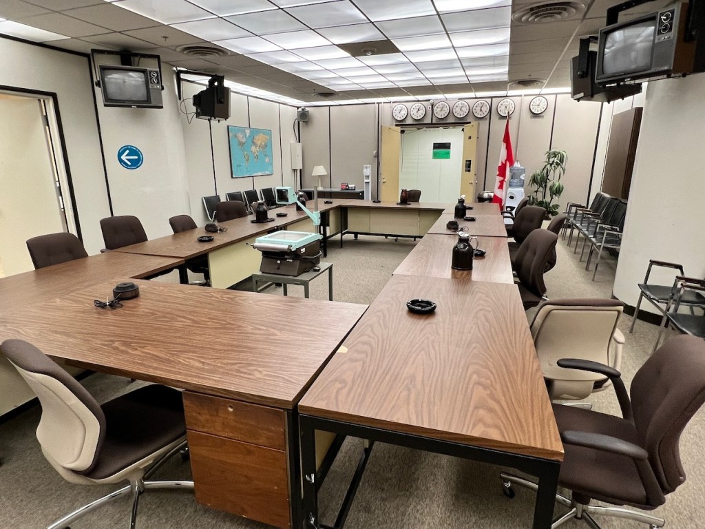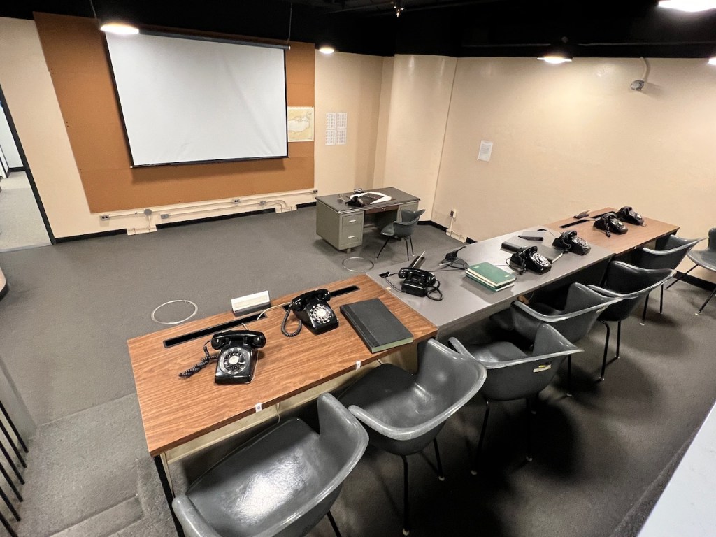 Immediately adjacent to the Federal Warning Center was the War Cabinet Room. The War Cabinet Room contained what would have been the working equipment during this period. Analog clocks, overhead projectors and cathode ray televisions marked the room.