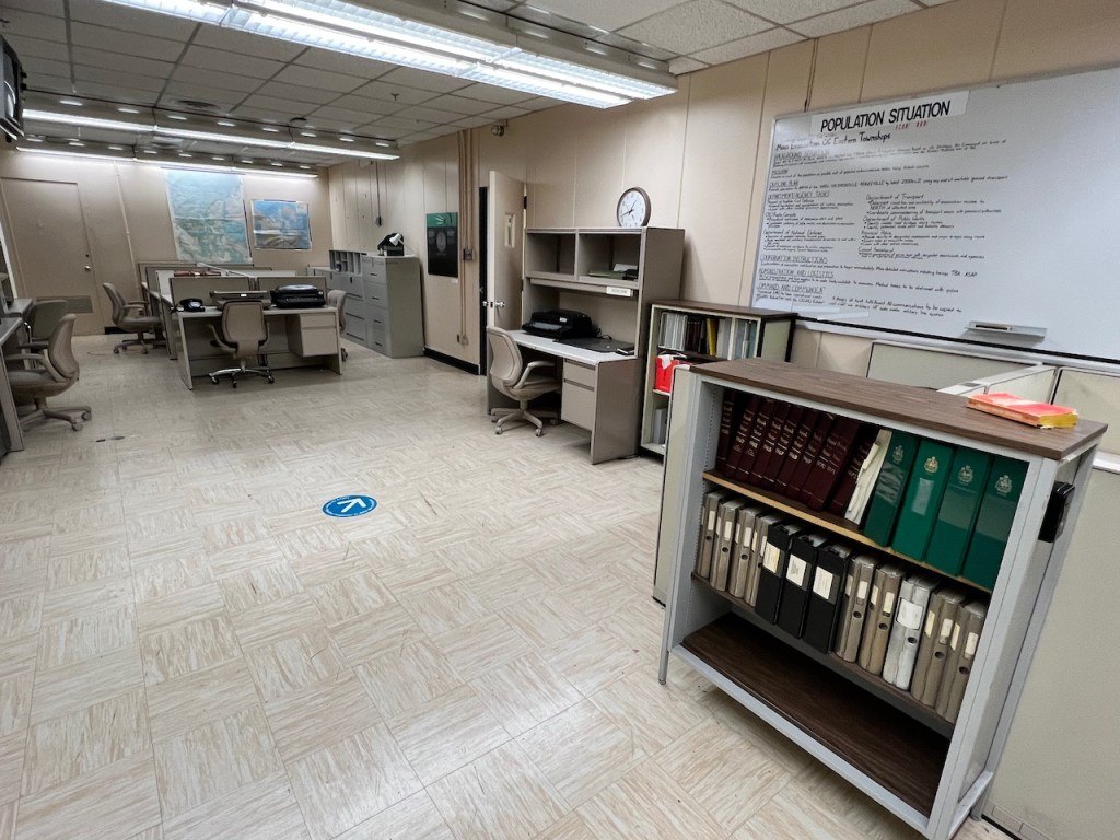 Immediately off the War Cabinet Room were the war secretariat offices. The space was covered with authentic looking predicted fall out cartography maps. Additional rooms contained population damage simulations and facilities along with analyst desks for the necessary calculations.
