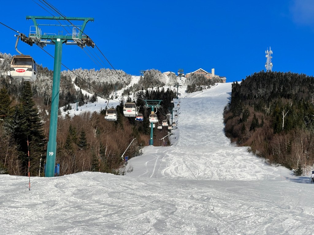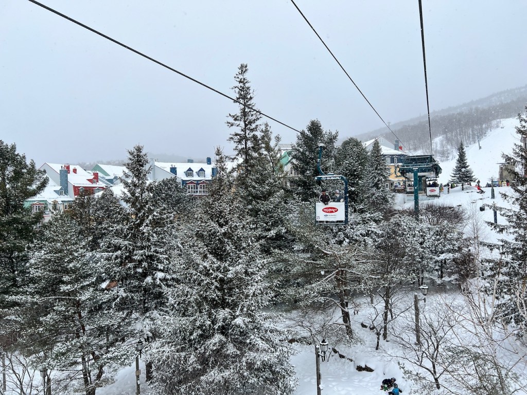 I took the short cabriolet gondola up to the upper village where I could join the lines for the main Tremblant Télécabine Express (Gondola). It was a snowy morning having just had the same dump of snow in Ottawa, so things were looking a little grey.