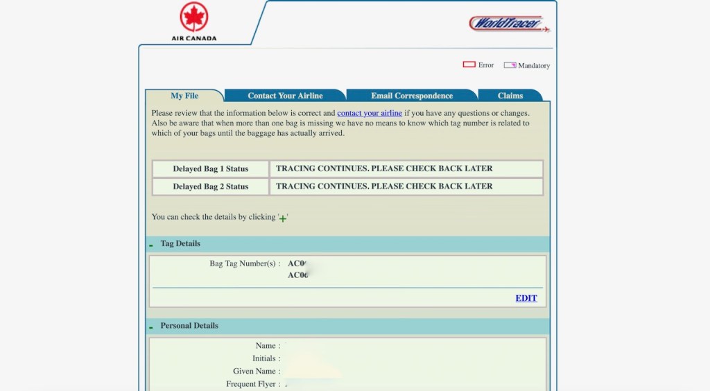 Perhaps not surprisingly, the AC Baggage Tracer system was still lagging and showing the bag as missing with “Tracing Continues – Please Check Back Later“.