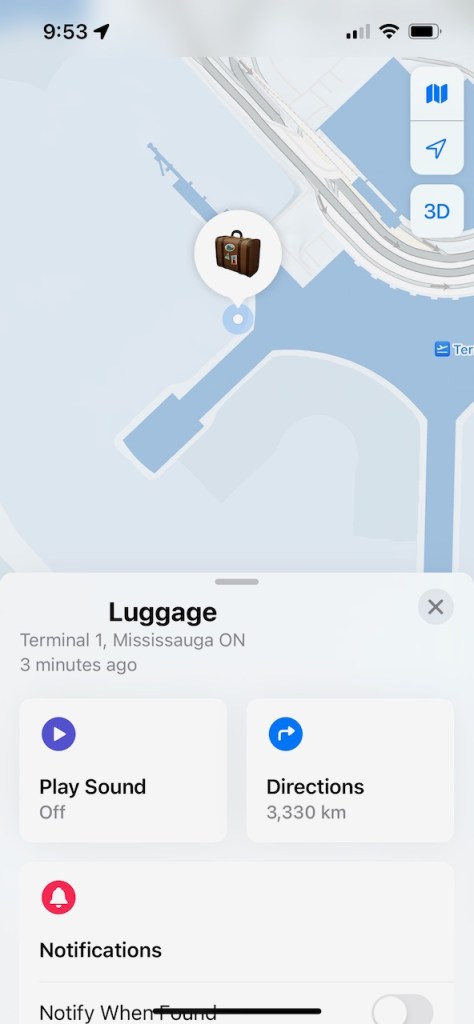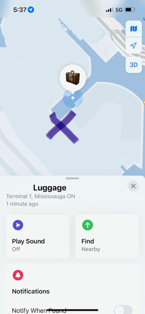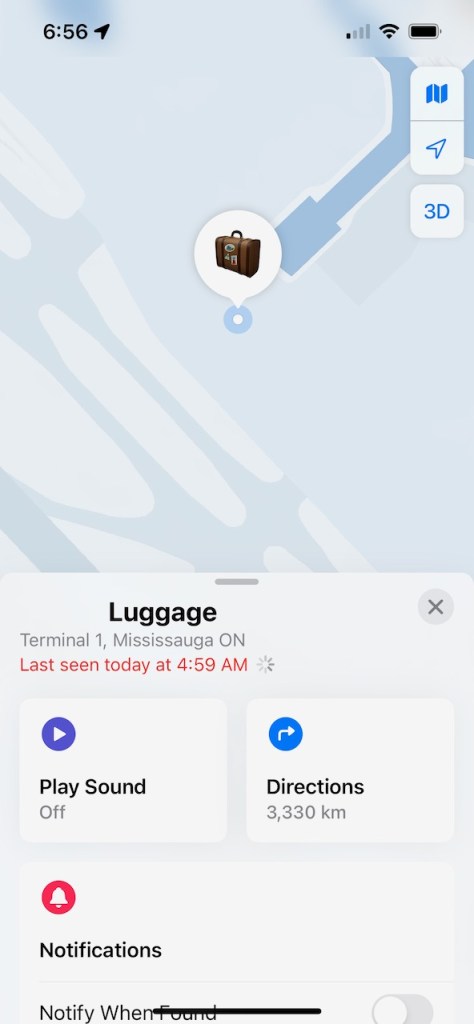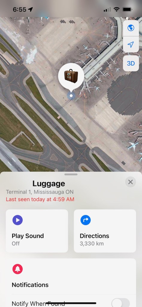 Checking into the “Find My” app, I learned that my bag had likely been loaded onto an Air Canada flight from Toronto to Vancouver. My bag was reported to be “last seen today at 4:59 AM“, with what appeared to be a location matching an outer gate area on the Toronto Pearson International Airport Terminal One.