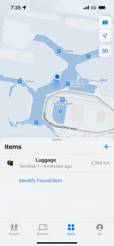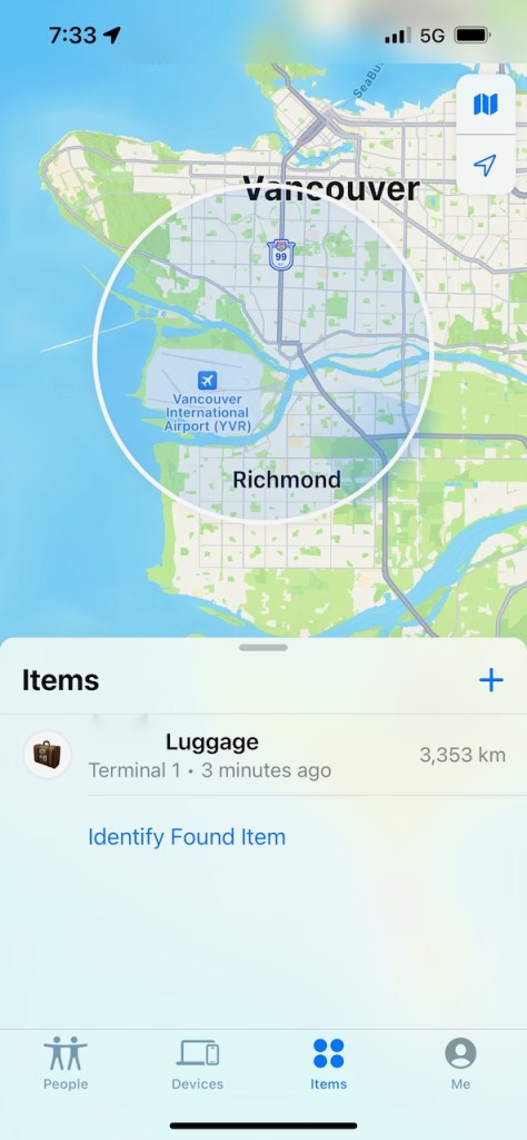 When I landed at Vancouver International Airport after my transcontinental flight, I popped open the iPhone “Find My” app again. It took a little while for the system to update itself after travelling some two thousand miles.