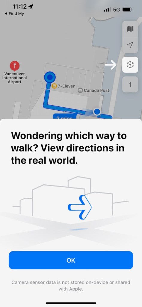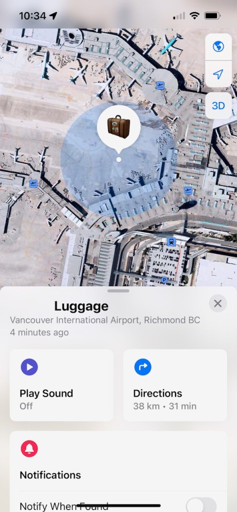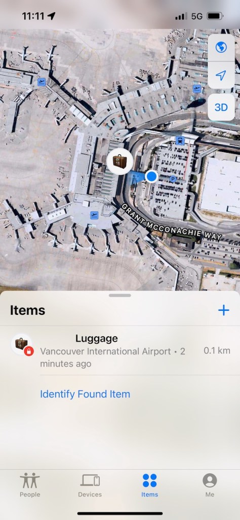 On arrival to the Vancouver International Airport, I ended up using the tracking feature in the Apple AirTag in order to get re-united with my lost luggage. Coming in from the Vancouver International Airport parkade, it was reasonably easy to locate my luggage using the features in the iPhone “Find My” app.
