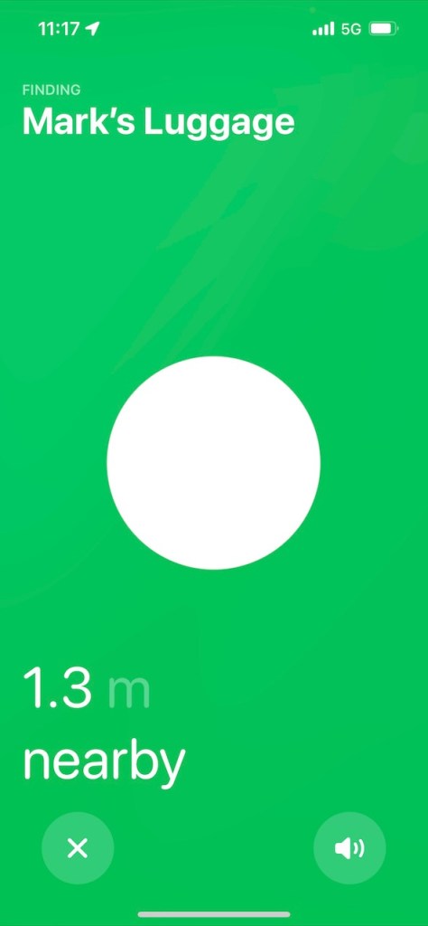 The closer you got, the screen changed to a “Hot” vs “Cold” searching feature. Ideally, this would pin point you to the exact location. In my case, i was in a baggage hall with dozens of similar looking black bags. It wasn’t an exact science, but I eventually got to within a meter or two and was able to figure it out.