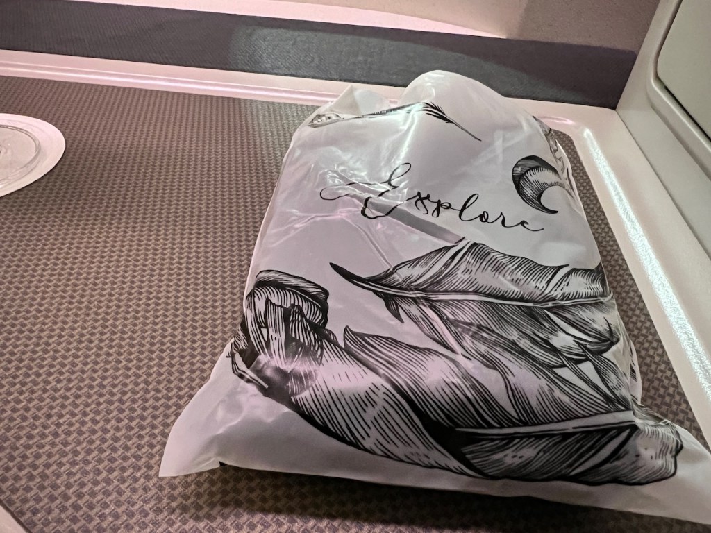 Today’s amenity kits consisted of a simple eye mark, ear plugs and socks in a recycled plastic bag. Generally speaking, it wasn’t worthy enough to take with you.