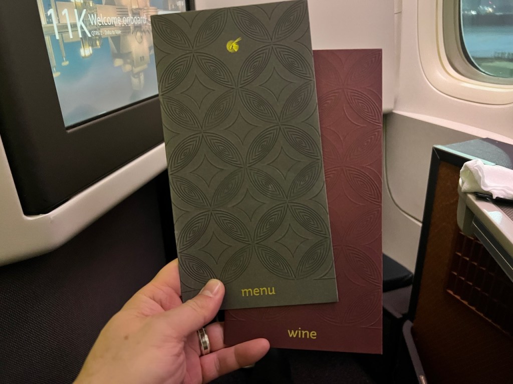 Qatar Airways offered a purser introduction while we settled in and were waiting for departure. Despite asking for it, Qatar Airways didn’t offer their more expensive Champagne Alexandra Laurent Perrier Rosé 2016 while on the ground in Doha, Qatar. Instead, we enjoyed the more mainstream Piper Heinsciek NV champagne.