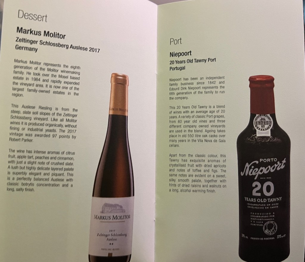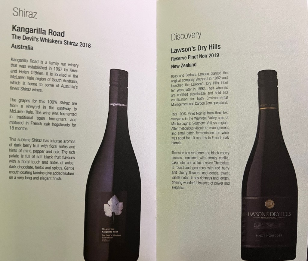 As final flight preparations were finishing, we were offered a dinner and wine menu for this flight.