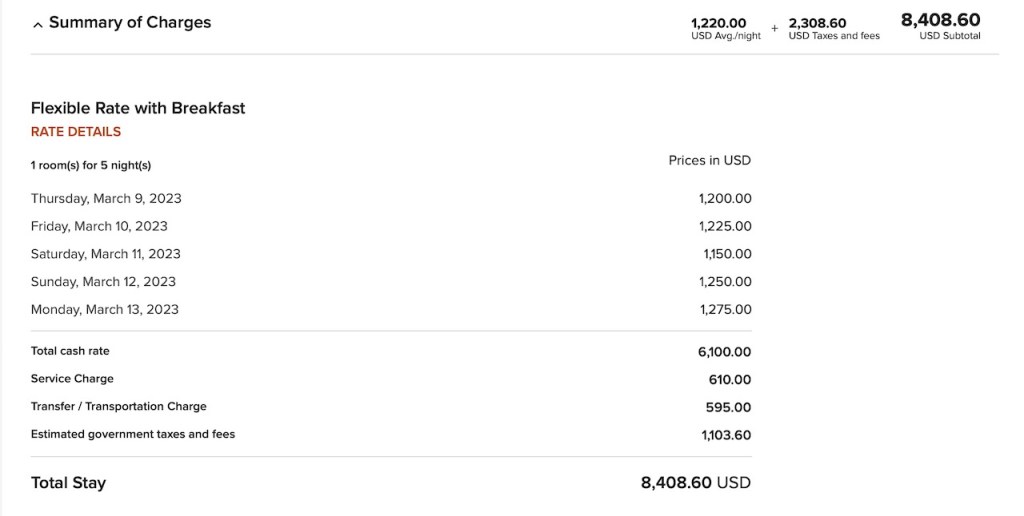 For comparison, the paid cash rates were approximately $1,181 USD average per night. By using points, we were able to get $6,100 in room charges on a complimentary basis as a result of a great use of Marriott Bonvoy points.