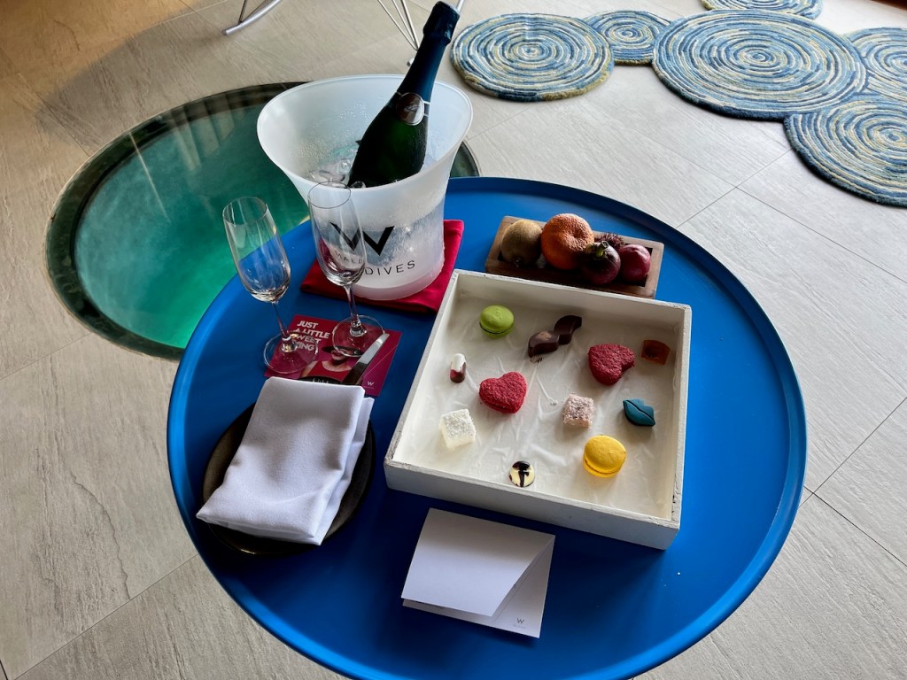 The W Maldives left us a terrific Marriott Bonvoy Platinum welcome amenity consisting of a plate of macaroons and a chilled bottle of prosecco sparkling wine.