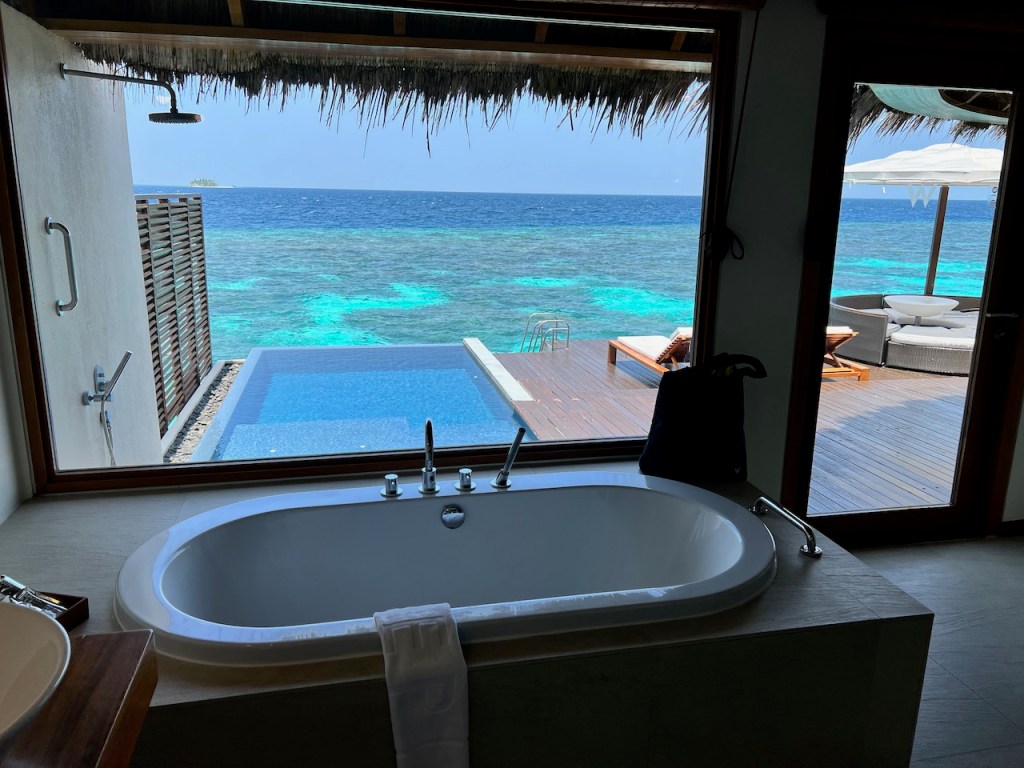 Along with every room from the Fabulous overwater Villa, there were terrific views from the large soaker tub and the bathroom.