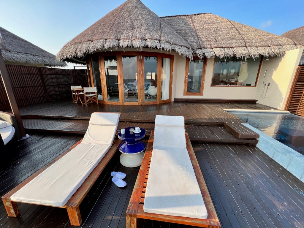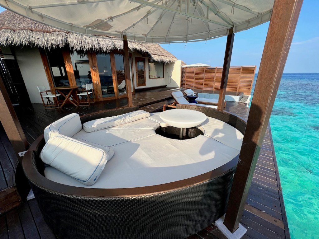 The W Maldives Fabulous Overwater Villa offers a great outdoor deck space. The deck space offers two reclining loungers, a covered gazebo for dining (or lounging) and a table and chair for two combination.