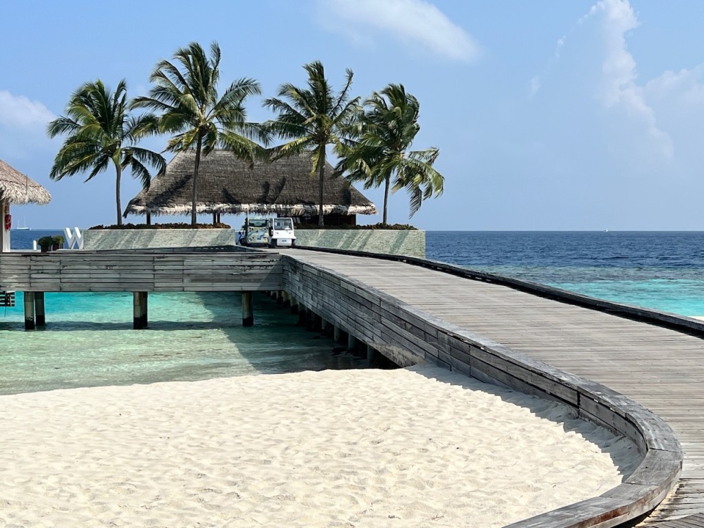 The W Maldives Beach is centrally located. The W Maldives Beach features a west facing sunset orientation near the foot of the over water villa pontoons and the arrival jetty.