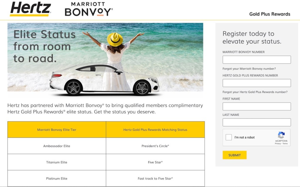 The registration process seems fairly easy. The website asks for your Marriott Bonvoy number, your Hertz Gold Plus Rewards number, along with your first and last name. The terms and conditions promise that the new status will be reflected in your Hertz Gold Plus Rewards account in five days.