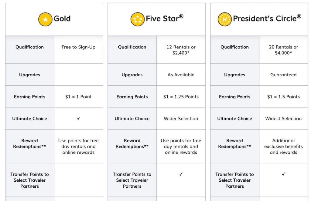 Hertz Gold Plus Rewards offers three tier levels of Gold, Five Star and it’s top tier President’s Circle. It’s around the Hertz Presidents Circle level where the benefits get interesting.