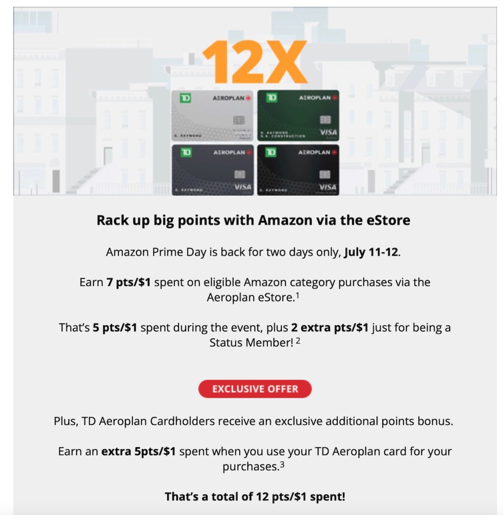 There are a number of points available for qualifying purchases on Amazon Prime Day. Assuming that you can meet the categories, sign into the Aeroplan E Store, and make the purchase on a Toronto Dominion Air Canada Aeroplan Visa, you should be eligible for up to 12x points per dollar of spend.