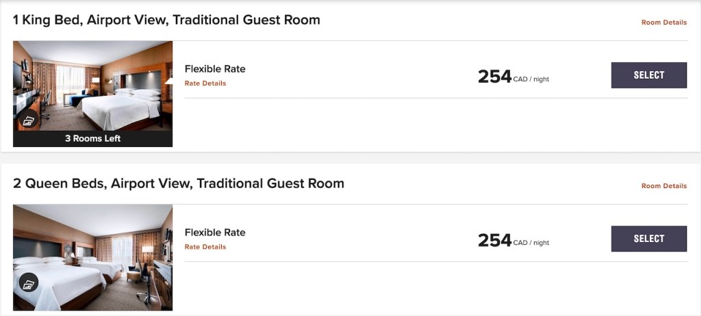 When booking at the Sheraton Toronto Airport Hotel and Conference Centre, I was able to get a regular Marriott Bonvoy Membership Rewards rate of $254 CAD which booked into the basic 1 King Bed, Airport View, Traditional Guest Room. While I usually leverage my husbands’ higher elite status, I needed elite qualifying nights to re-qualify for Platinum this year as a result of a drop in work travel. As a result, I booked the room under my name direct on the Marriott Bonvoy website. As a Marriott Bonvoy Platinum Level member, I would also be entitled to Upgrade to best available room, including select suites.