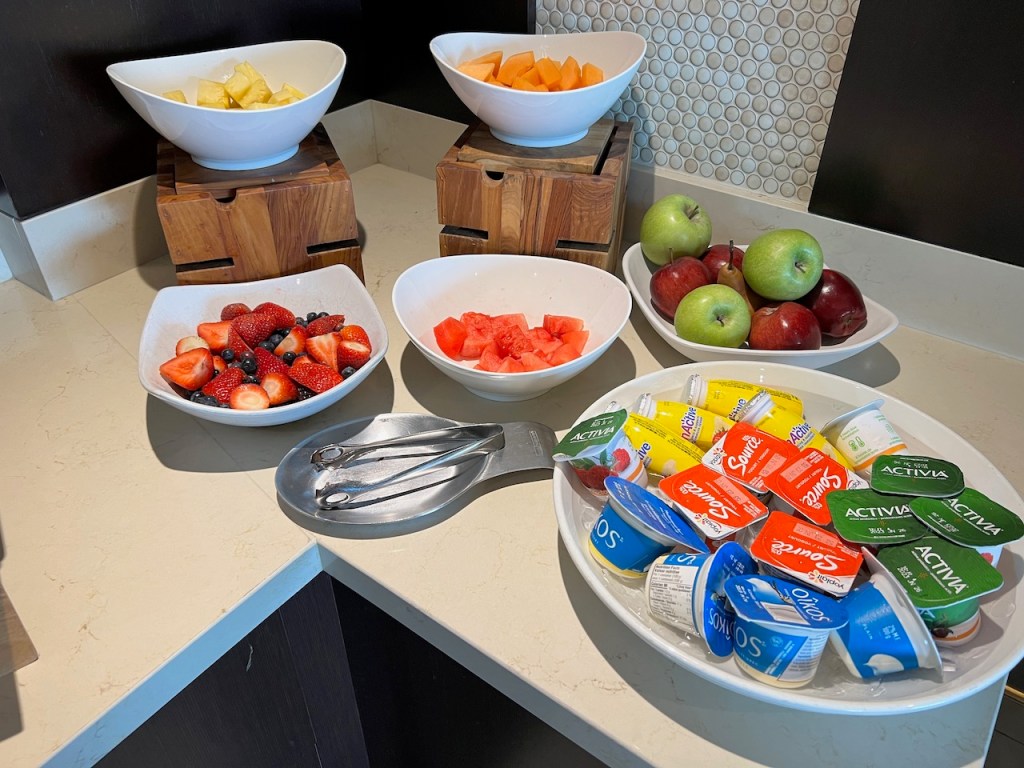 The breakfast was the standard Sheraton / Marriott lounge variety. In addition to two hot items, there were several cereal silo towers, fresh fruit, yoghurt and a few baked items.