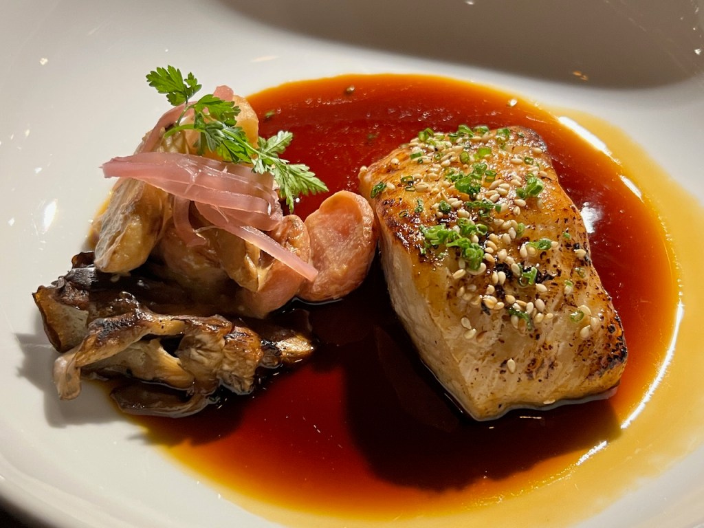 For the main course, I went with the Sablefish – turnip, radish, maitake mushroom, sesame, roasted bone fish sauce. The Sablefish was presented and the bone fish sauce poured freshly at table side.