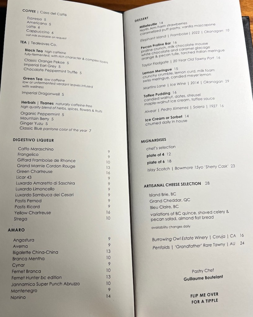 The wine list was diverse and featured a large variety of British Columbian wines, along with your favourite selections from the old world regions of France and Italy. We settled on a familiar but special bottle of Burrowing Owl Pinot Gris; always a local British Columbia Okanagan favourite