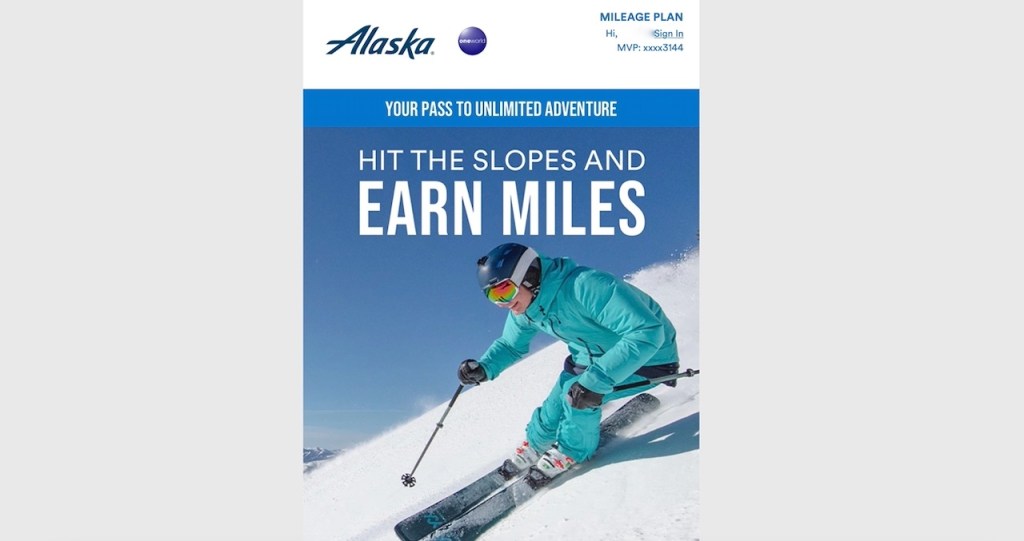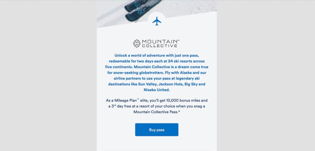 Alaska Airlines MVP Elites are being offered an additional 10,000 Alaska Airlines Mileage Plan miles if they purchase a Mountain Collective ski pass when purchased through a dedicated link. They are also offered an additional ski day at a preselected resort at time of purchase.
