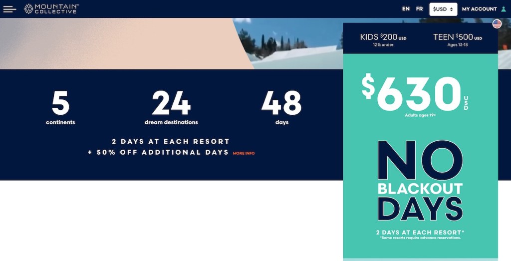 The passes are selling for $630 USD this season, which allows access to 48 days. of skiing across 24 resorts worldwide.