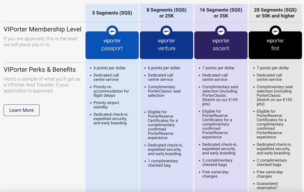 Provide verification of your Aeroplan status or the number of segments (SQS) you’ve flown so far this year, as shown in your Aeroplan account and Porter Airlines will match it as detailed in the table below.
