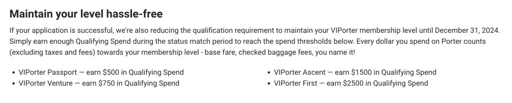 In order to maintain the following level,s you’ll have to spend the following amount(s) with Porter Airlines.