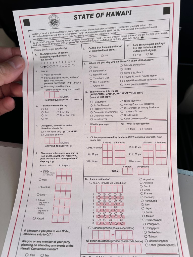 While we waited for the dinner, the flight attendants passed out the State of Hawaii questionnaire.