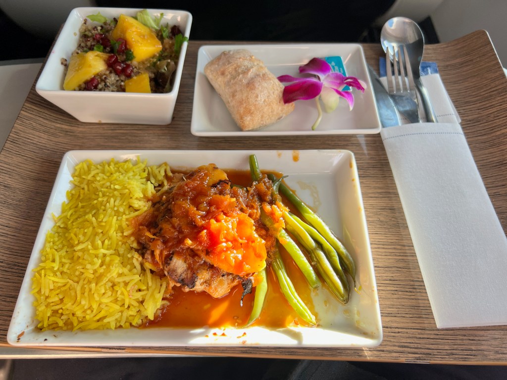 Dinner arrived a leisurely two hours into flight, or at 8:40 PM PST. Given that I had pre-ordered the Huli Huli Chicken, I had no issues getting my preferred choice.