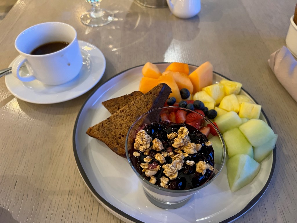 The first day, I enjoyed a continental breakfast. The continental breakfast featured banana bread, fresh cut fruit, along with a yoghurt parfait.