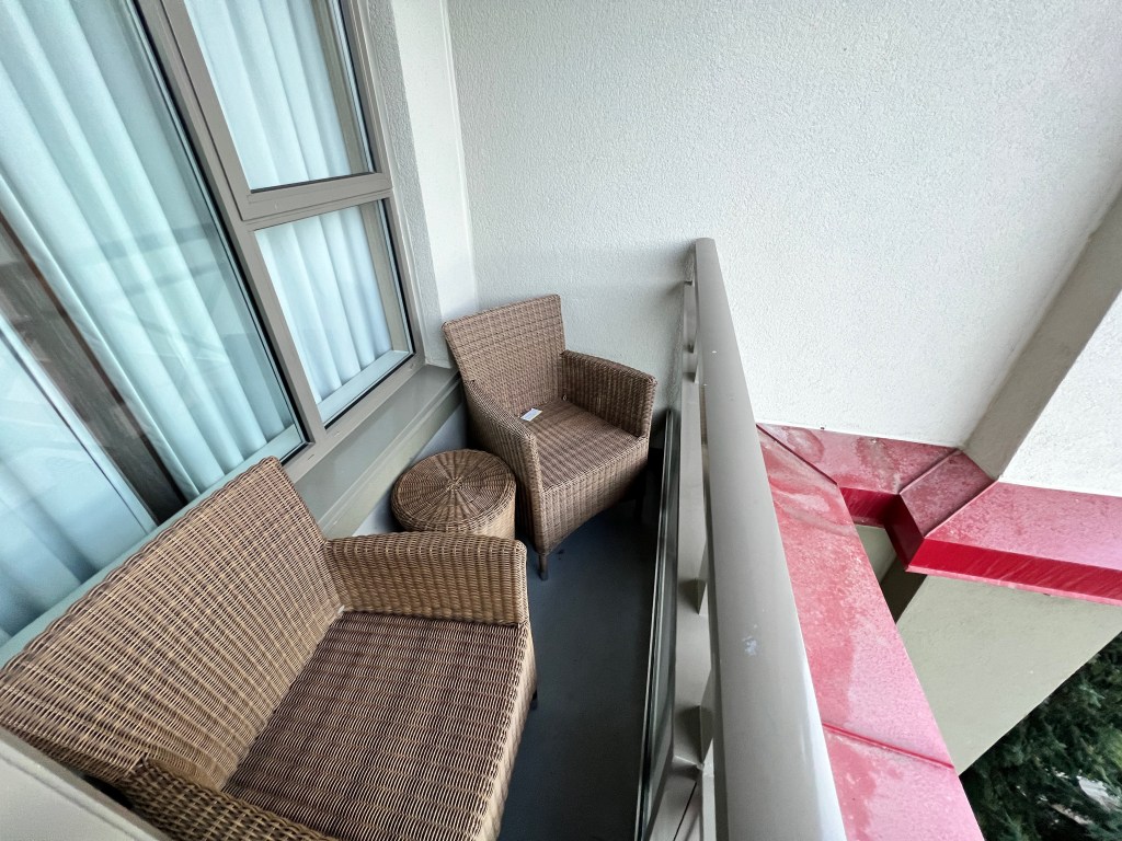 The living room offered a small balcony. Access to the balcony was via a door next to the fireplace. The balcony was pretty small, and aside from taking view photographs, I couldn’t imagine spending much time seated outside in this small space.