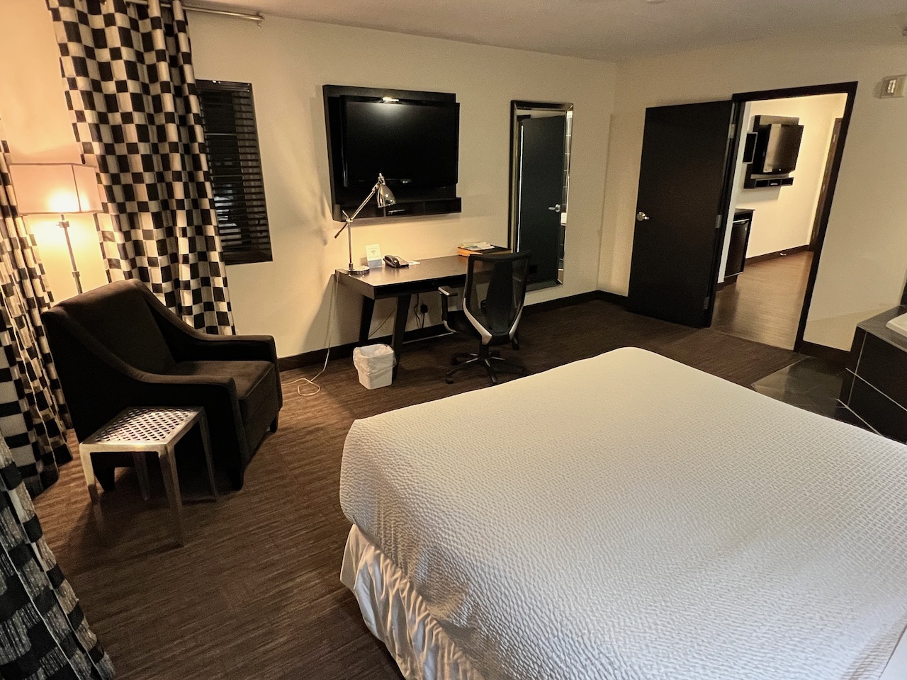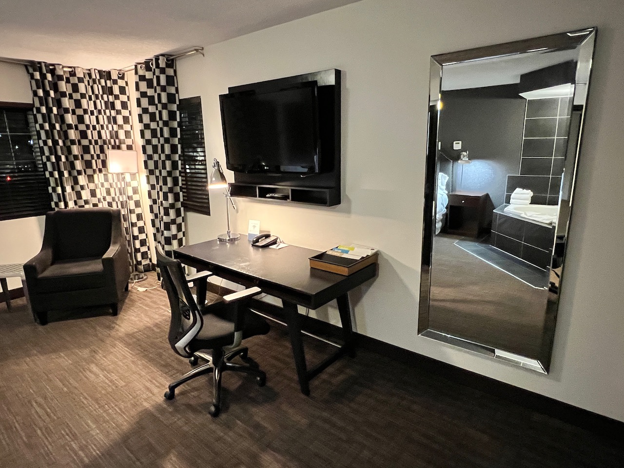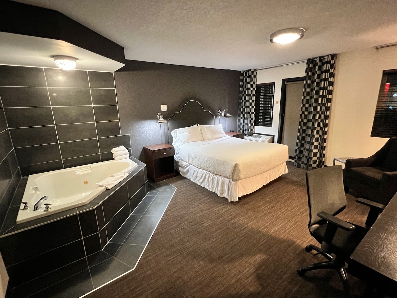 The second portion of the room contained the bedroom, which was decorated in a black and white theme that reminded me of a checkerboard. The bedroom contained a smallish queen bed, a jacuzzi tub that was likely in style in the end of the nineties, a small occasional chair and a small desk.
