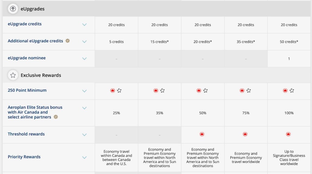 Air Canada Aeroplan status offers a lot less than it used to. At the lowest level at Aeroplan 25K, you’ll be offered priority services that consist of Priority Check In, a small amount of e-upgrade credits that can be used to upgrade into business class, a 250 point minimum, a bonus on Aeroplan miles earned on Air Canada and select partners (United, Lufthansa), along with complimentary baggage allowance.