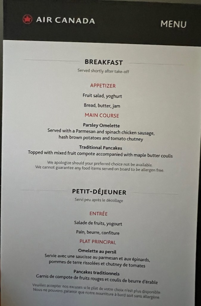 During the pre-departure period, the flight attendants also passed out a printed breakfast menu. Air Canada continues to offer a printed menu, which is a great touch that makes the service feel more upscale.