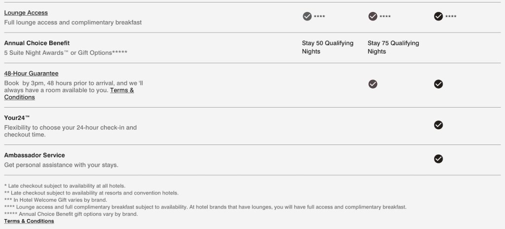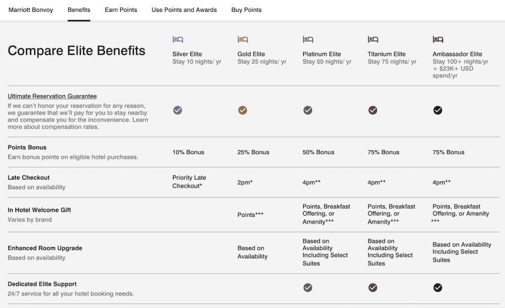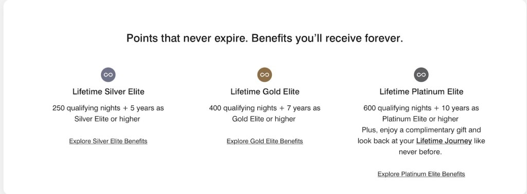 The Marriott Bonvoy Lifetime Program has three separate levels. Each are achieved after a substantial amount of travel.