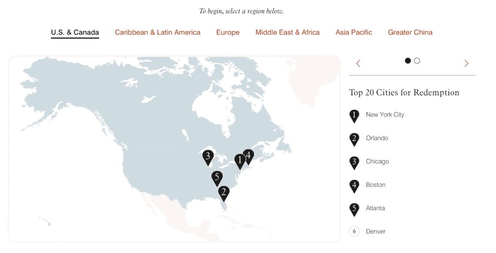 The next portion of the website revealed some information on the most popular Marriott Bonvoy redemptions. This area was separated by region mostly centered around a continent. Showing where the world is headed these days, Greater China had it’s own section on the map.