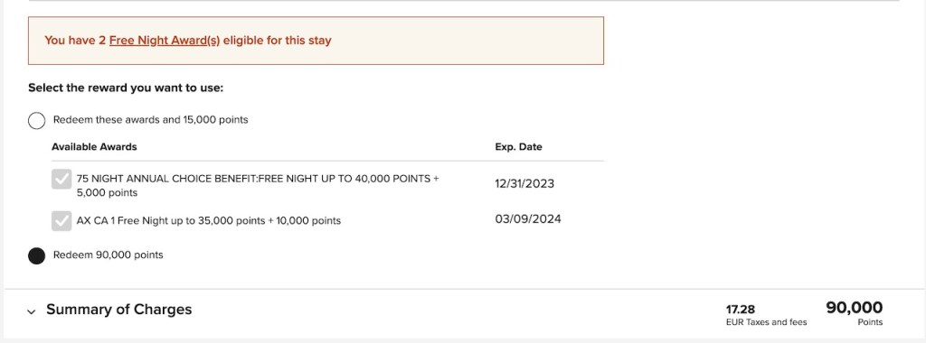 Our stay cost 17.28€, and 90,000 Marriott Bonvoy points for the two nights. I had to pay an extra 10,000 Marriott Bonvoy points to make up the shortfall from the 35,000 point free night award.