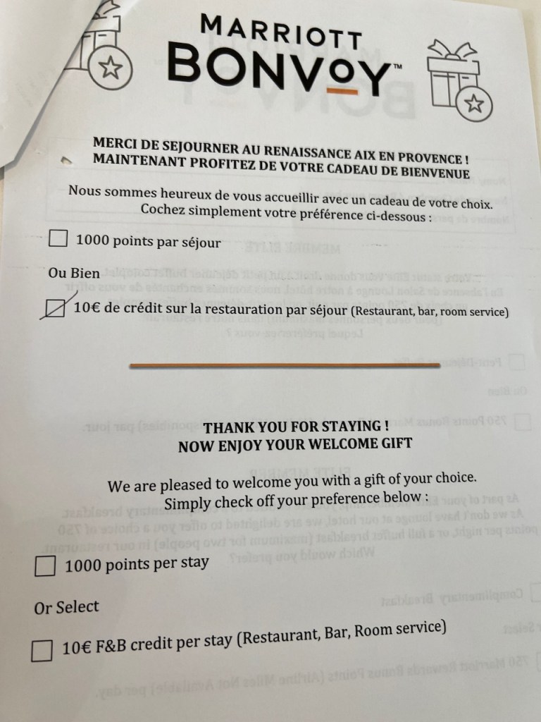 Courtesy of Marriott Bonvoy Titanium status, we were also provided with a choice of 1,000 Marriott Bonvoy points, or a “one time” 10€ food and beverage credit that was valid for the entire stay, (not per person nor stackable) day over day.