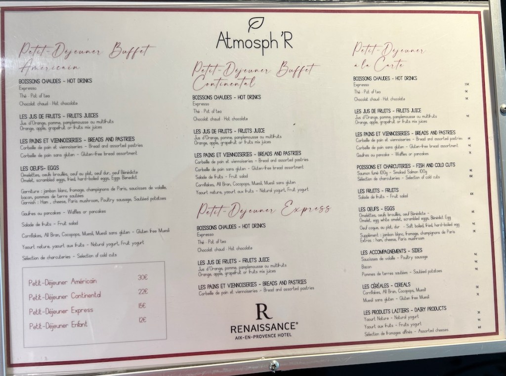 For those that were unable to get breakfast within the room rate, the full buffet was charged at 30 €. Unlike our other breakfast at Le Méridien Nice, there was no sparkling wine offered at breakfast at the Renaissance Aix – En – Provence Hotel.