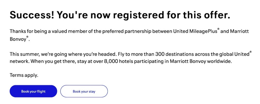 - An “Eligible Itinerary” consists of (i) an Eligible Participant (ii) having an itinerary documented with a confirmation number, (iii) booked with money (iv) completing a flight from such itinerary operated by United or United Express, and (v) travel begins no later than August 31, 2024, 11:59 p.m. EDT. Flights booked with miles or “money and miles” are not eligible for this Promotion. Eligible Participants will earn 750 Marriott Bonvoy bonus points for each unique Eligible Itinerary.