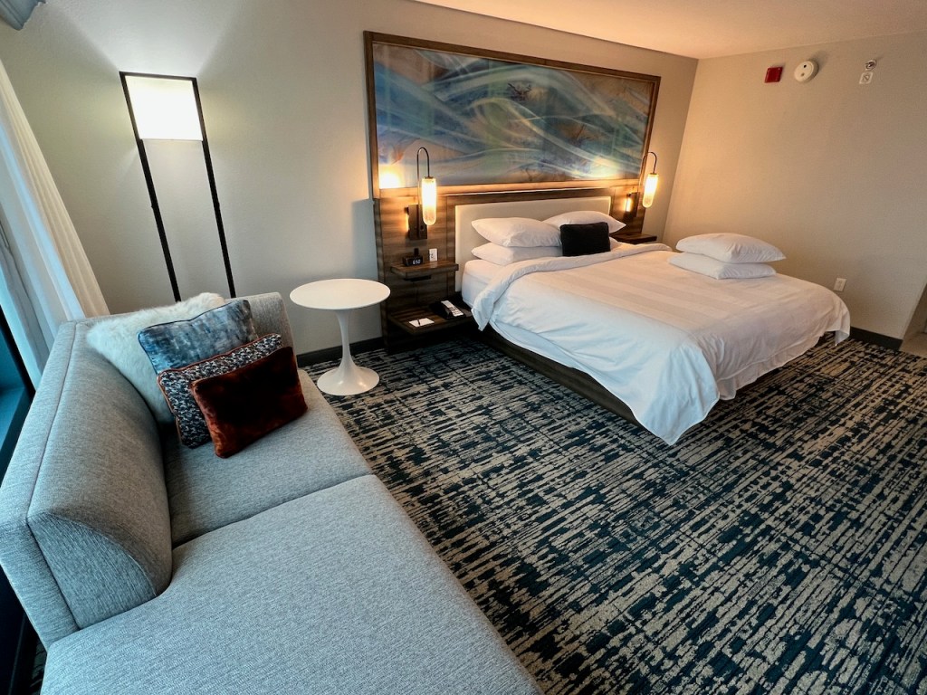 Once we entered the hotel room, we arrived to a beautifully renovated room that had modern colours and furniture. The renovation was recently completed and it brought the Marriott Anchorage downtown into the current contemporary business hotel era.