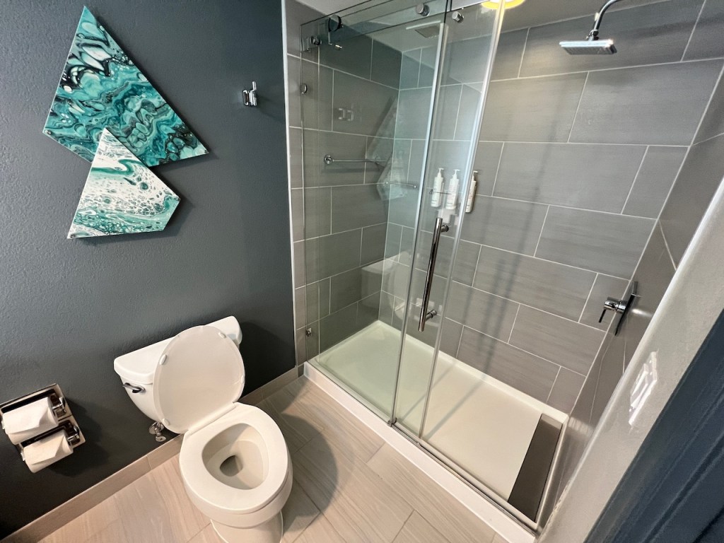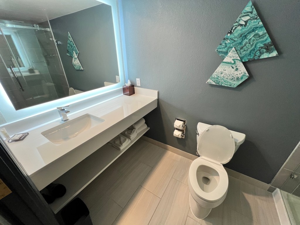 The Marriott Anchorage Downtown offered a renovated bathroom. The bathroom was a little small for two people, however it’s much larger than a bathroom than you’d expect in a tiny older hotel. The bathroom offered a rain shower which was a little weak on water pressure, but fit the need perfectly.