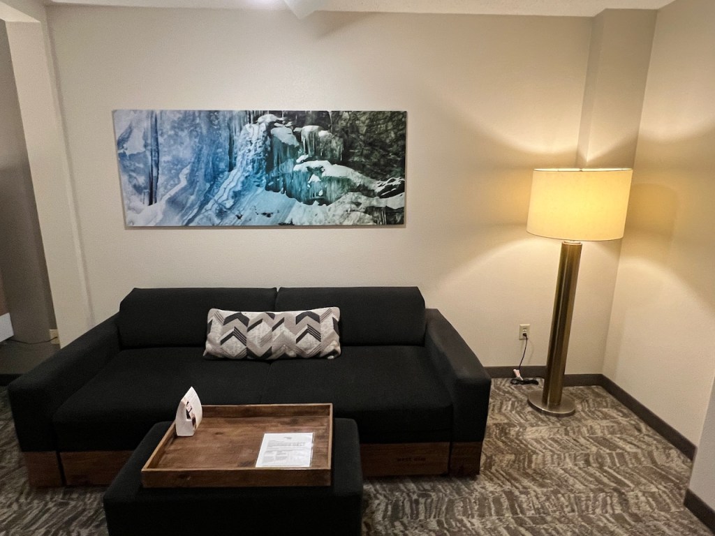 Immediately upon entering the room, we found ourselves in the studio suite living space. Springhill Suites has a current contract with West Elm furniture to provide their “in room” couches.