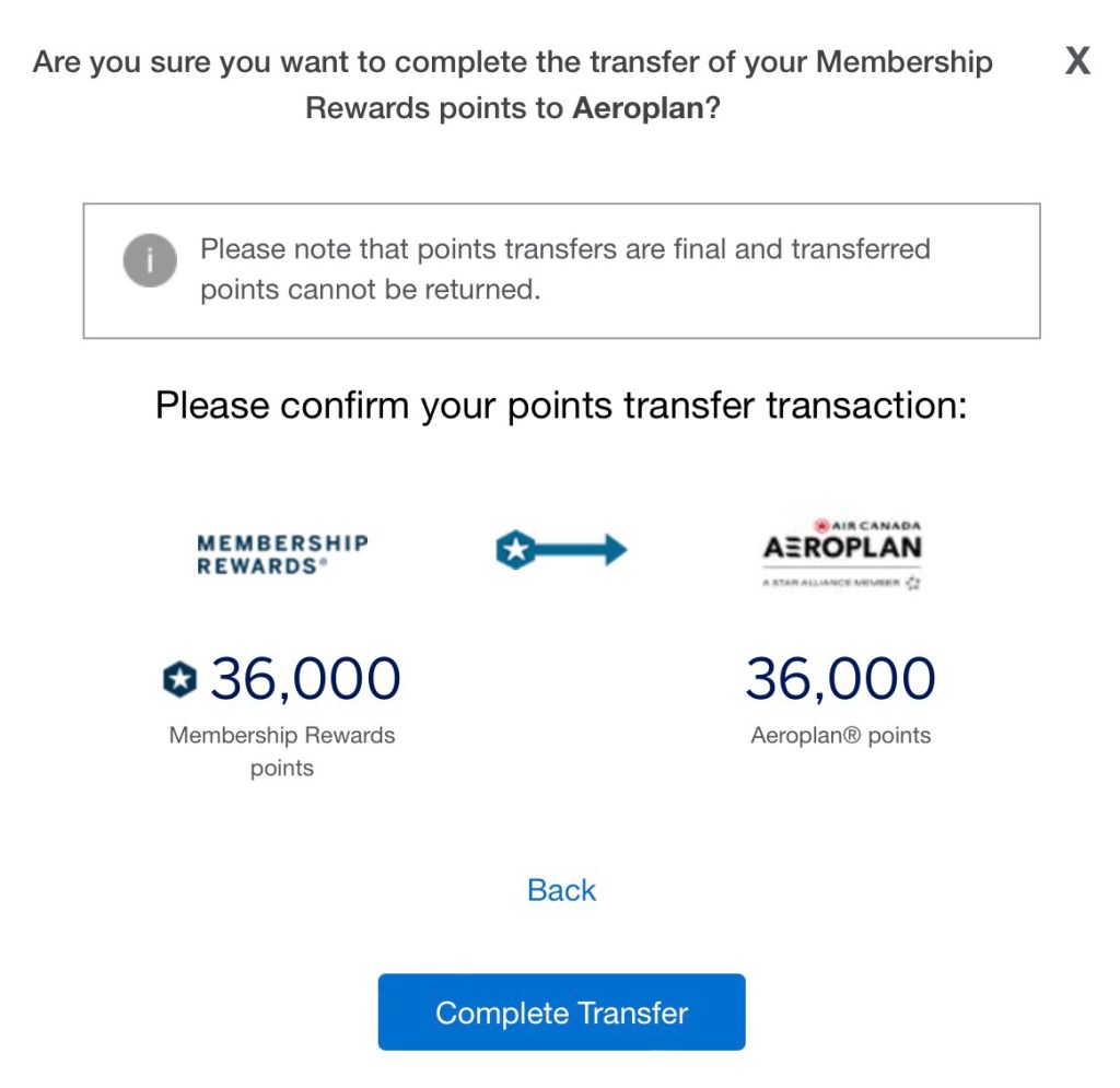 I had to top off my Air Canada Aeroplan account with a small amount of points from American Express Membership Rewards in order to make this happen. The transfer took approximately fifteen minute and was seamless.