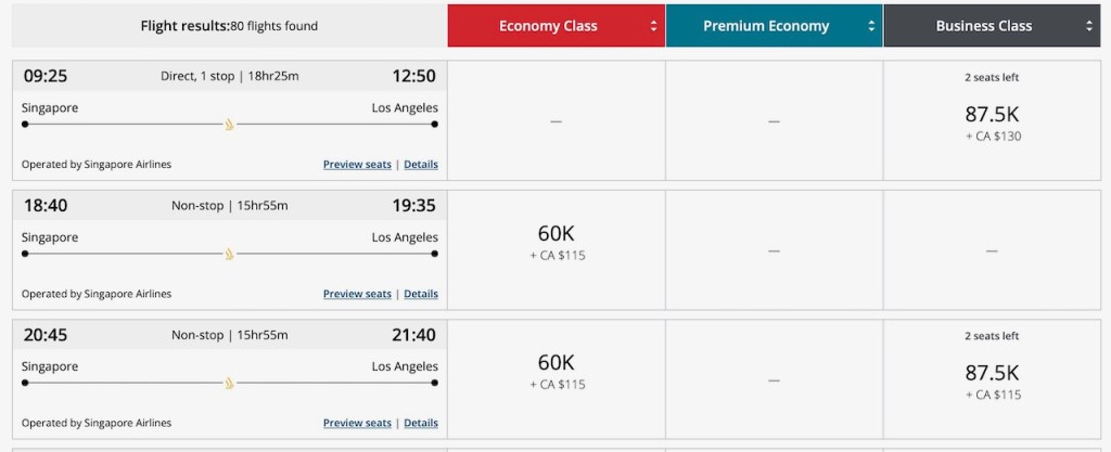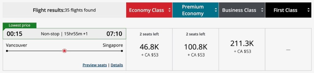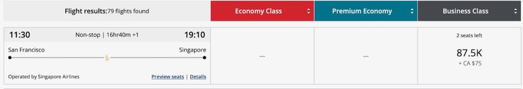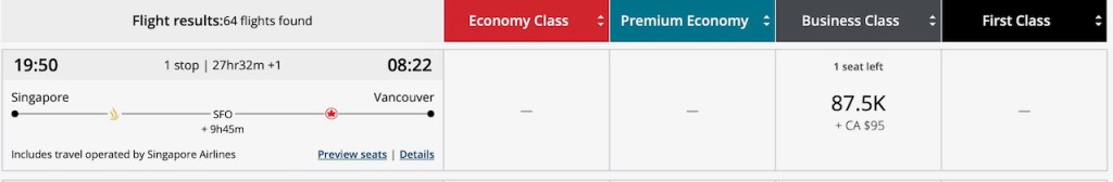 I was not able to get the required Air Canada segments in saver reward space to the departure and arrival cities of San Francisco and Los Angeles. As a result, I ended up purchasing two positioning flights from Vancouver to the Singapore Airlines gateway cities in Air Canada Business Class. I ended up with Air Canada Business Class Vancouver – San Francisco, and Air Canada Business Class Los Angeles – Vancouver.