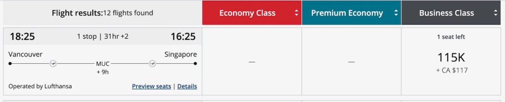 I was able to study the Star Alliance business reward availability release patterns, and I discovered that Lufthansa was typically releasing limited business class award space at about 14 days out, if capacity was soft. These combinations offered terrible nine hour layovers in Germany, and came at a higher 115,000 Aeroplan miles each due to the longer distance. While not ideal, this offered an option to connect on the longer Vancouver – Munich – Singapore.